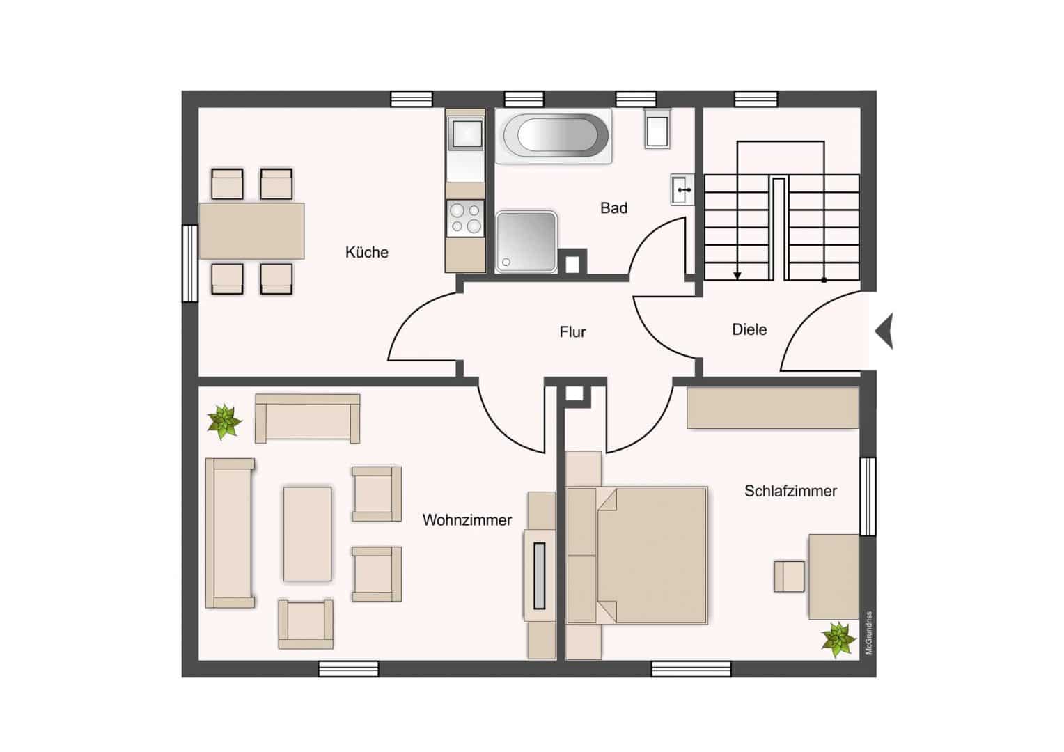 Derzeit liegen ausschließlich die Grundrisse des Ursprungsbaus vor. Diese stellen den heutigen Gebäudebestand daher nicht vollständig und originalgetreu dar. Das Objekt wurde im Laufe der Zeit erweitert und umfasst im Erdgeschoss ein zusätzliches Durchgangszimmer zwischen Flur und Schlafzimmer. Im 1. Obergeschoss wurden ein Wintergarten sowie ein weiteres Zimmer ergänzt. Darüber hinaus verfügt das Dachgeschoss über ein Gäste-WC, einen Technikraum sowie ein zusätzliches Zimmer.