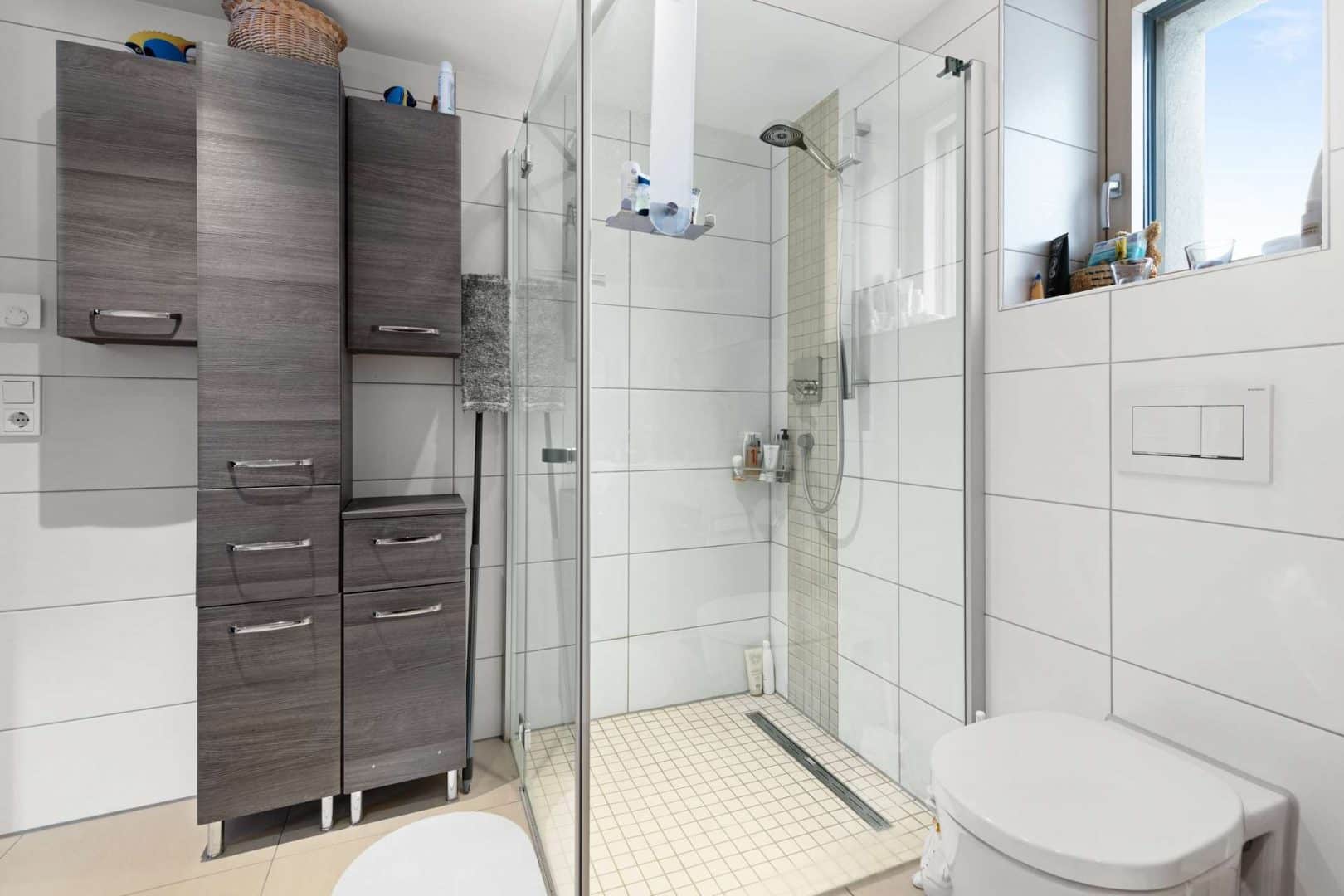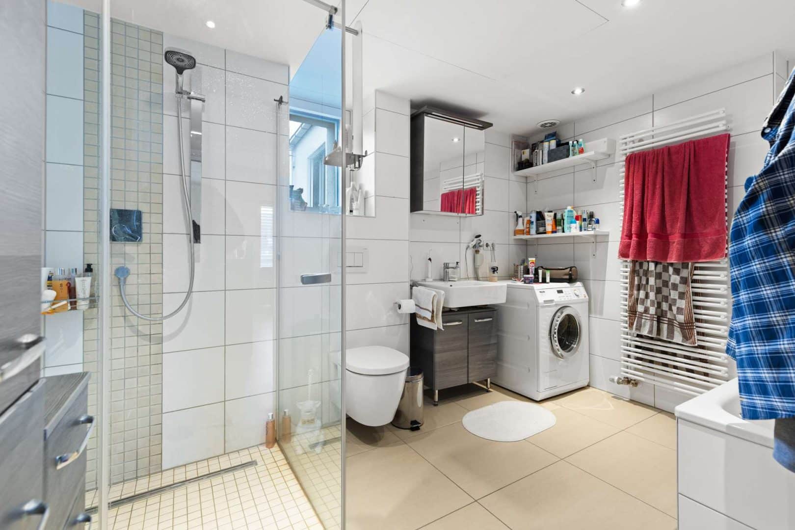 Das moderne Badezimmer ist zeitlos gestaltet und verfügt über eine Dusche, eine Badewanne, einen Waschtisch, ein WC sowie einen praktischen Waschmaschinenanschluss. Ein ruhiges Schlafzimmer sowie ein weiteres Zimmer, das sich ideal als Kinder-, Gäste- oder Arbeitszimmer eignet, runden das Raumangebot ab.